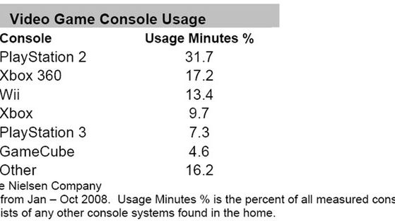 Jak inaczej nazwać można wyniki badań, które widzicie powyżej. Szczerze mówiąc sam uważam je za przegięcie i nie do końca miarodajne, ale... skądś musiały się wziąć. Zgodnie z tym co jest napisane, najwięcej czasu procentowo gracze poświęcili PS2. To akurat jest zrozumiałe, konsola w co drugim domu, tanie gry i tak dalej. Kolejne dwa miejsca dla Microsoftu i Wii również nie budzą większych emocji. No, może poza tym, że można było oczekiwać więcej po Nintendo. A tak, konsole leżą w domach i się kurzą. Dalej oczywiście PS3... wróć. Dalej... pierwszy Xbox! PS3 umiejscowiona między już dawno martwą konsolą Billa, a Gamecubem? Nie do pomyślenia. 16% przeznaczone na "inne" też jest zastanawiające - sporo osób gra na jeszcze starszym sprzęcie. Niech nie zdziwi Was brak PSP czy DSa - badania dotyczą jedynie platform stacjonarnych. Ja przyznam szczerze, że nie tego się spodziewałem i ciekaw jestem, jak wynik podobnych badań wyglądałby w Europie.