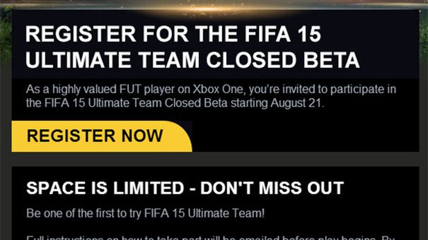 Posiadacze FIFY 14 na konsolach Microsoftu donoszą o zaproszeniach do zamkniętej bety FIFA 15 Ultimate Team. Według informacji zawartych w wiadomości od EA Sports, już 21 sierpnia wybrane osoby dostaną możliwość przetestowania najpopularniejszego tryby dostępnego w grze. Oficjalna witryna EA przez chwilę linkowała do podstrony mówiącej, że zabawa dotyczy tylko platform Xbox One oraz Xbox 360. Niestety wszystko znikło tak szybko, jak się pojawiło. Na szczęście w Internecie nic nie ginie.