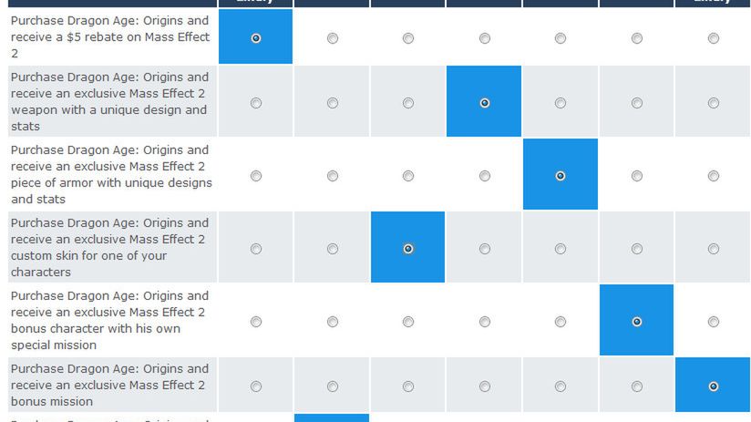 Ostatnia ankieta na temat Dragon Age i Mass Effect 2 sugeruje, że BioWare wraz z Electronic Arts rozważa możliwość nagrodzenia ludzi, którzy kupili obydwie gry. Przedstawione w niej pomysły mówią o zniżce na zakup, dodatkowych, specjalnych zbrojach, skórkach dla postaci, jak również całych pobocznych questach. Co wy na to?