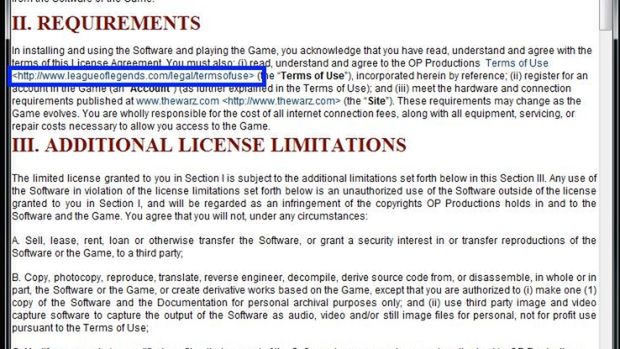 Jak każda gra sieciowa, wymaga od gracza akceptacji umowy licencyjnej, w której twórcy zabezpieczają się przed ewentualną kradzieżą własności intelektualnej. Problem w tym, że umowa licencyjna została skopiowana z regulaminu innej gry, w tym wypadku League of Legends, na dodatek na tyle nieumiejętnie, że znajdowały się w niej odnośniki do stron gry Riot Games.