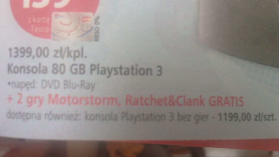 Sieć oferuje konsolę PS3 z dwoma grami "gratis" za 1399 złotych. Wersja bez dodatków kosztuje tymczasem... 1199 PLN.Ha, i wszystko jasne! Grami za 200zł jest MotorStorm i Ratchet&Clank, więc oferta z grami jest tym bardziej bez sensu. Polowanie na frajerów trwa.