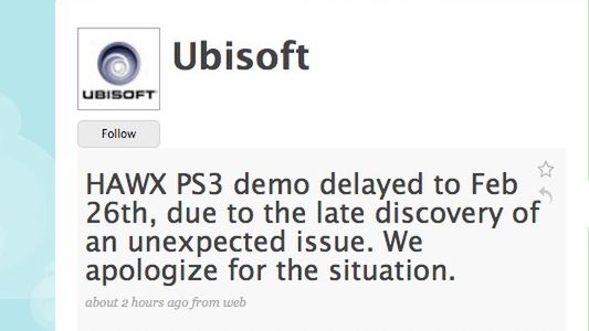 Niestety wychodzi na to, że posiadacze PS3 poczekają nieco dłużej na demo H.A.W.X. Ubisoft na swoim Twitterze poinformował, że z powodu pewnych usterek technicznych premiera wersji demonstracyjnej została przełożona na 26 lutego. Podobno cierpliwość jest cnotą.