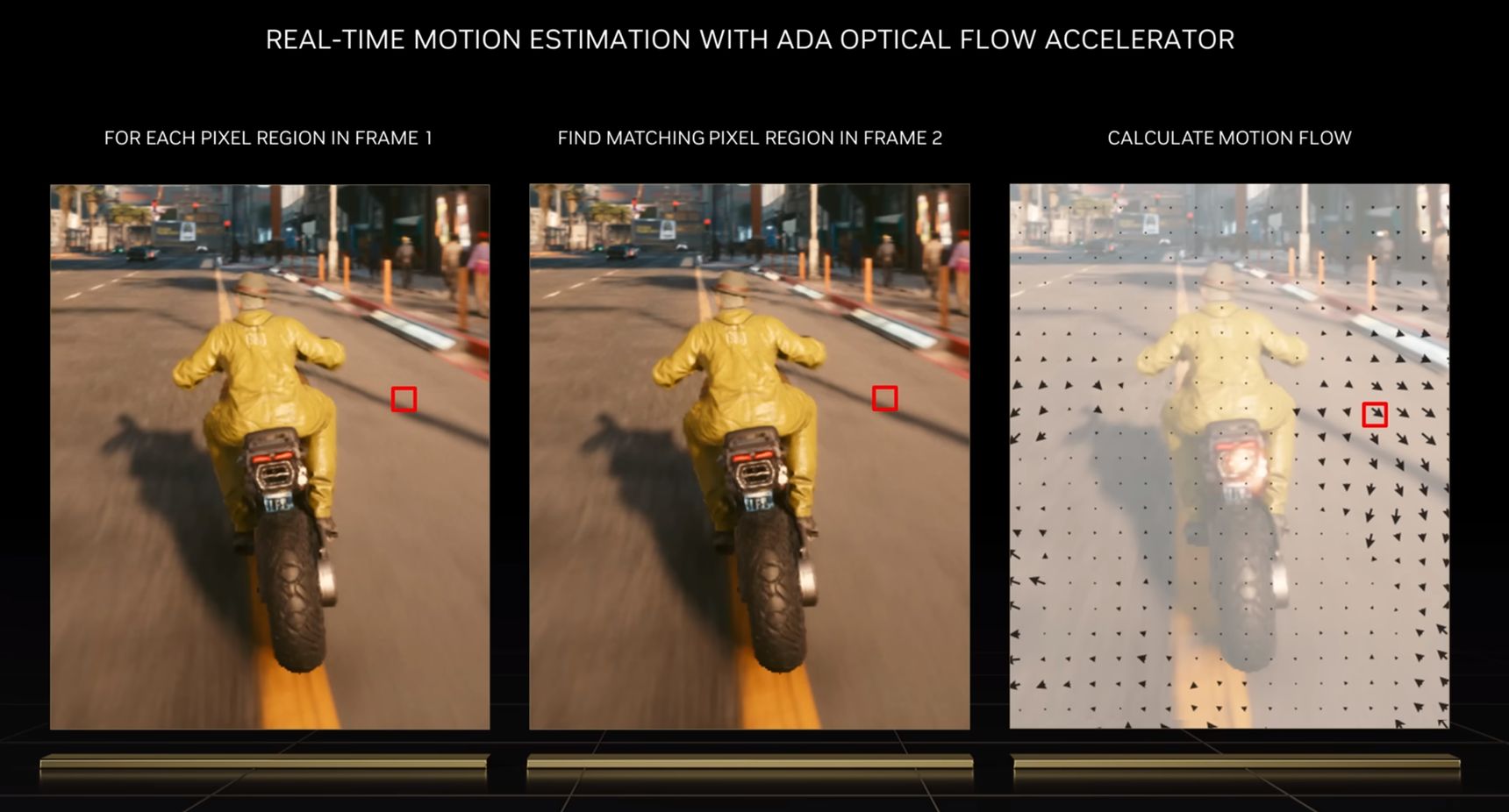 Następny krok to nowatorska technologia wykorzystania sztucznej inteligencji znana jako "Optical Multi Frame Generation". Generator ramek przy pomocy Optical Flow Accelerator (element rdzenia Ada Lovelace), analizuje dwa sekwencyjne obrazy w grze, a także wylicza ich dane wektorów ruchów zarówno dla obiektów jak i wszystkich elementów znajdujących się w kadrze.