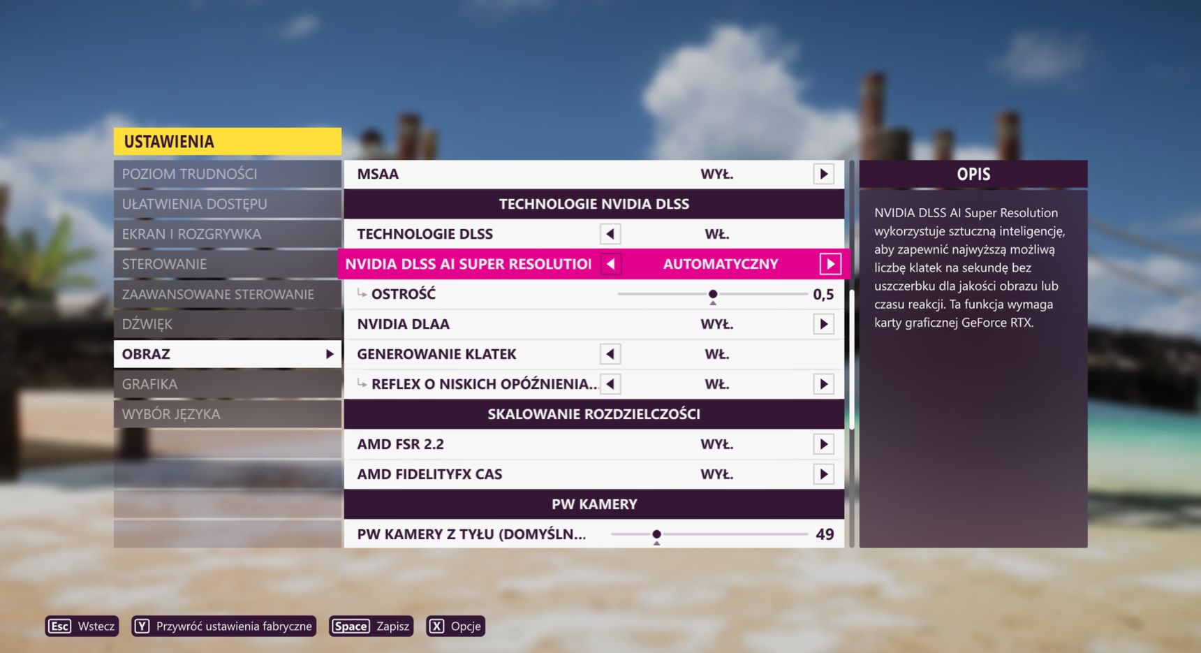 Forza Horizon 5 - gdzie przydadzą się dodatkowe klatki, jak nie w tej cudownej wyścigówce rozrywkowej? Muszę przyznać, że jakość obrazu i liczba klatek były dla mnie tu sporym zaskoczeniem. Niestety ze względu na ograniczenia sprzętowe - 8 GB VRAM, nie byłem w stanie ustawić ekstremalnych ustawień, a jedynie wysokie, i ponownie rozdzielczość 1440 p. Na zrzutach ekranu widzimy tryby DLSS: jakość, automatyczny, zrównoważony, wydajność i wysoka wydajność, oraz z wyłączonym DLSS 3.