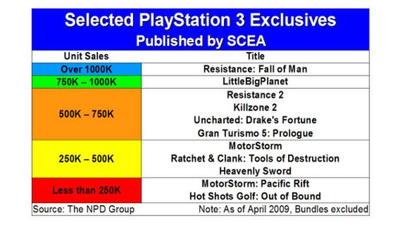 Sony od początku stawiało na tytuły ekskluzywne od swoich studiów wewnętrznych. Polityka ta wydaje się mieć sens, w końcu firma posiada najwięcej deweloperów z wielkiej trójcy, jednakże jak widać Amerykanie niezbyt chętnie kupowali wydawane przez SCEA gry. Tylko pierwszy Resistance przekroczył w Stanach magiczną barierę jednego miliona sztuk, nie udało się to między innymi Uncharted i Killzone 2. Z pewnością da się również zauważyć pewien trend, że Amerykanie interesują się zdecydowanie bardziej grami, w których się strzela, co niestety przekreśla świetnego MotorStorma: Pacific Rift.