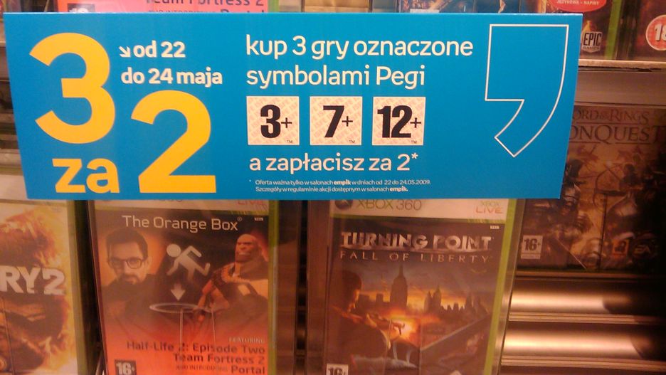 W Empiku pojawiła się ciekawa promocja. Nawet nie chodzi tutaj o to, ile zapłacimy za dany tytuł, ale o uświadamianie klientom, że jest coś takiego jak PEGI i kategorie wiekowe dla gier. Pomysł super. Brawa dla Empiku.