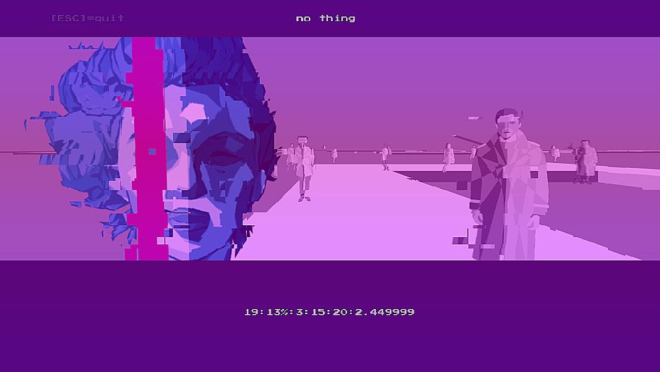 Szybki wstęp powinien być właściwie taki, że jeśli całkowicie gardzicie "artystowskim gie" (w sensie kupą), to No Thing (zapisywane, rzecz jasna, małym literami) będzie idealnym produktem do głośnego wyśmiania. Bo kosztuje zazwyczaj mniej niż dziesięć złotych, więc żaden to wydatek, a ubaw może być nie z tej ziemi - gostek biegnie wektorowymi ścieżkami, otaczają go płaskie, obracające się wraz z punktem skupienia kamery sprity, leci banalna muzyczka, ekran co chwilę zmienia jaskrawy kolor, w tle gada syntezator mowy, a jedynym celem jest przebiegnięcie do końca. "Beka" nie z tej ziemi. Gorzej, jak komuś to w nieokreślony sposób "kliknie".