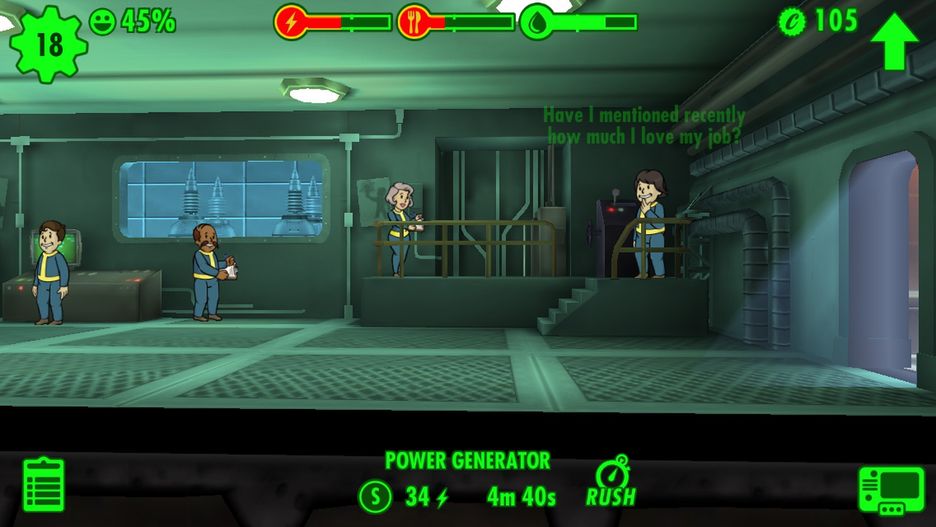 Wisienką na torcie jest podejście naszych mieszkańców do stosunku pracy - po skończeniu cyklu nie zabiorą się za następny do czasu ręcznego zebrania zasobów przez gracza. Trzeba wiec wciąż skanować schron w poszukiwaniu zakończonych projektów, bo czas to pieniądz, a 30 sekund przestoju w oczyszczalni może zaważyć na kryzysie w dostępie do wody. Gra perfidnie balansuje na granicy naszej uwagi: produkcja trwa na tyle długo żebym zaczął zastanawiać się co robię ze swoim życiem klikając na wirtualny schron, a nie dość długo żebym mógł obejrzeć kilka minut swojego ulubionego serialu bez konieczności kontroli wirtualnych podopiecznych.