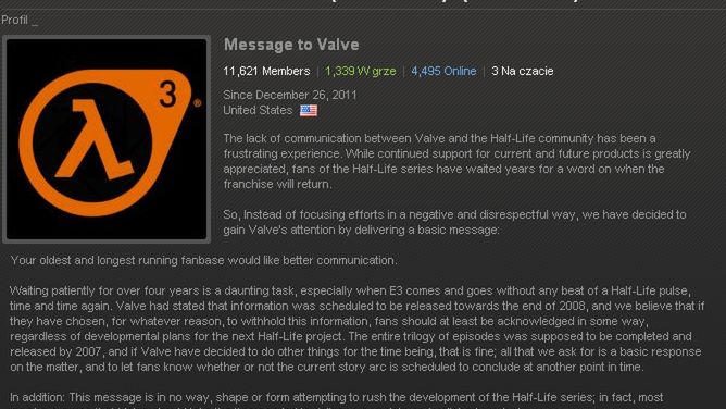 Ta wiadomość w żaden sposób nie jest próba przyśpieszenia prac nad serią Half-Life. W rzeczywistości, większość członków zgadza się, że Valve powinno mieć tyle czasu ile potrzebuje, aby dostarczyć pełny i dopracowany produkt. Czy to coś da? Kto wie. Jeśli ludzi zbierze się dostatecznie dużo, to może Valve się pochyli i powie, co jest grane. W momencie w którym piszę te słowa, do grupy należy już ponad 11 tysięcy osób.