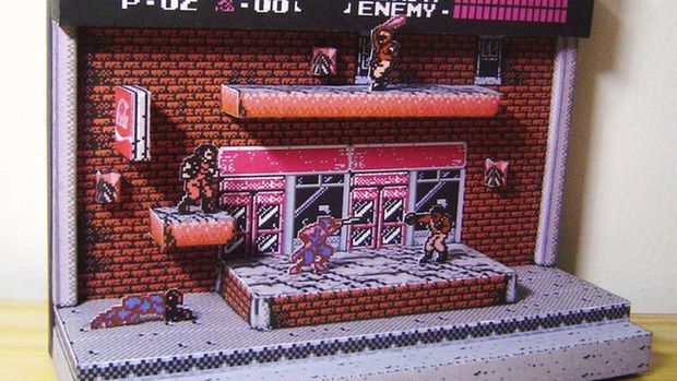 Raz na jakiś czas i na naszym blogu pojawiają się ciekawe figurki z gier, natomiast z reguły te najfajniejsze kosztują przynajmniej równowartość nowej gry, a często i więcej. Co zrobić więc, gdy chcemy udekorować swój pokój gracza, ale żal nam funduszy na zbierający kurz kawałek plastiku? Można wykonać np. powyższą dioramę ze stareńskiego Ninja Gaiden. Prawda, że ładna? Wystarczy stąd ściągnąć odpowiedni PDF, wydrukować, poskładać i voila.