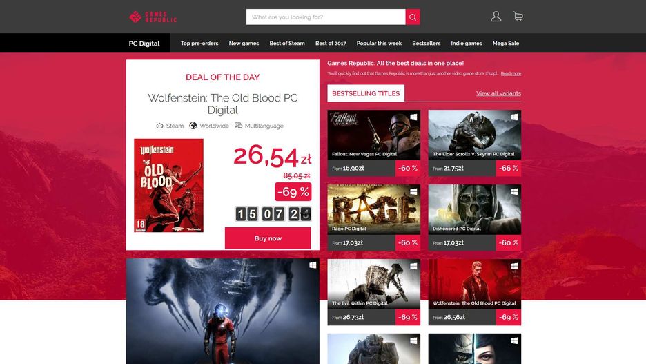 Szukając na Games Republic na przykład Dirt 4 znajdziemy zarówno grę (stemowy klucz) w sklepie, jak i listę ofert na innych platformach - CD Keys, GreeManGaming, Inexus czy jeszcze kilkunastu innych. W tej chwili trwa promocja na gry Bethesdy, możemy więc kupić steamowego Wolfensteina czy Dishonored w promocyjnych cenach. Nie możemy jednak porównać ich cen z konkurencją - jeszcze nie wszystkie gry dodano do porównywarki, albo nie wszystkie są cały czas widoczne dla użytkowników. Trochę dziwna wybiórczość jak na porównywarkę, która z definicji ma być miejscem, gdzie w pierwszej kolejności idziemy przed kupnem jakiejkolwiek gry na PC. Większość ofert to steamowe klucze, ale brakuje tam też zwykłej, steamowej ceny.