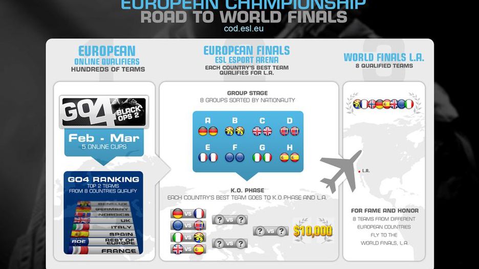 To finał, a żeby się do niego dostać należy wziąć udział w serii cotygodniowych internetowych Turniejów Go4BlackOps2, które rozgrywać się będą między 3 lutego, a 3 marca. 16 najlepszych zespołów z całej Europy będzie rywalizować w ostatecznej rozgrywce w ESL eSports Valhalla w ESL Arena Studio w Kolonii, który odbędzie się w dniach 16-17 marca. Tam stoczą walkę o jedno z ośmiu miejsc na Call of Duty Championship, które odbędzie się w Los Angeles i o nagrodę 10 000 dolarów.