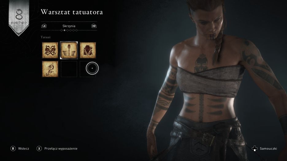 W oczy równie mocno rzucają się opisy w panelu robienia Eivor tatuaży. Gdy wybieramy ozdobę z przodu ciała, wyświetla się "Skrzynia". Tu też wydaje się jasne, że ktoś źle przełożył słowo "Chest", które oznacza także klatkę piersiową. Podobny problem z plecami - zamiast tego słowa widzimy "Wstecz" (od angielskiego "Back").