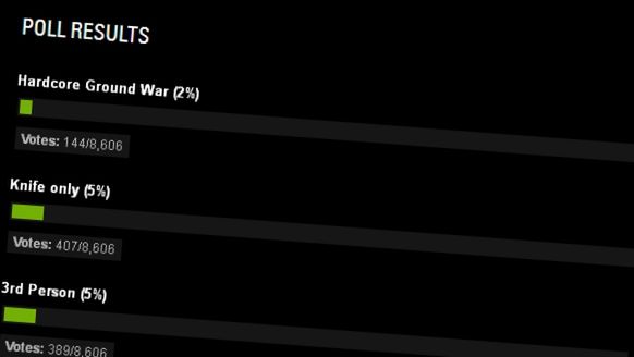 W momencie w którym piszę te słowa w ankiecie wzięło udział 8606 osób. Oprócz snajperskiego trybu dużą popularnością cieszy się tryb adaptujący do gry zasady z esportowych turniejów Major League Gaming.
