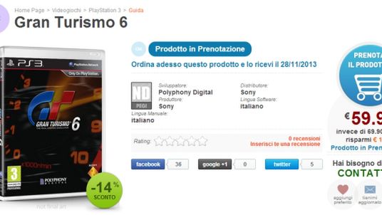 Tymczasem w dwóch sklepach - amerykanskim NewEgg oraz włoskim Multiplayer.com pojawiły się strony produktu Gran Turismo 6. Serwis Eurogamer twierdzi, że przy pierwszej była też data premiery: 28 listopad 2013, ale obecnie żadnej nie widzę.