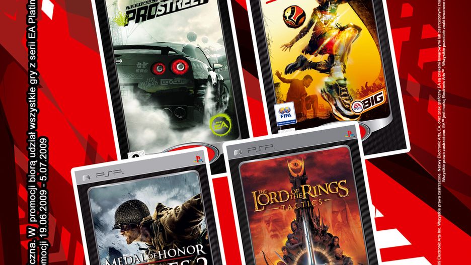 Mamy przyjemność poinformować, że zorganizowaliśmy specjalną promocję naszych gier, przeznaczonych dla przenośnej konsoli PSP (PlayStation Portable). Akcja trwać będzie od 19 czerwca do 5 lipca i obejmować wyłącznie tytuły Electronic Arts z serii Platinum.