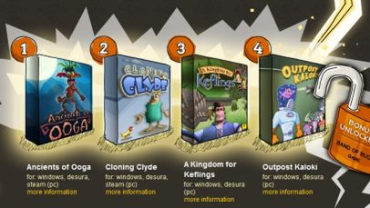 Ancients of Ooga: Clonging Clyde: A Kingdom for Keflings: Outpost Kaloki: Band of Bugs: Wszystkie gry w zestawie przeznaczone są na PC, po zakupie można je ściągnąć z platform Steam i Desura.