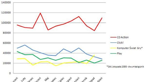 Upadek Clicka! sprowokował Huberta z Branży Gier do opracowania wykresu, który przedstawia, jak sprzedawała się nasza prasa branżowa w zeszłym roku. Warto zaznaczyć, że monitoringiem, który jest usługą płatną, choć kosztuje relatywnie mało, nie są objęte ani Neo Plus ani PSX Extreme. Co widzimy na wykresie? Dominację CD Action. Widać też wyraźnie, jak sprzedaż Clicka! spadała od września zeszłego roku, czyli w mniej więcej w momencie dodania konsol i zmiany formuły pisma. Swoją drogą, ciekawe czy w tym roku wyłoni się tytuł, który zajmie stabilne drugie miejsce. Liczymy też, na kolejne zestawienie z komentarzem za jakiś czas i na to, że w zestawieniu pojawi się więcej tytułów.