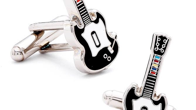 Ja jestem takim, że po prostu w niego gram w domowym zaciszu. Nie noszę firmowych koszulek, nie mam ustawionej tapety w komputerze, ot, szeregowy gracz. Co jednak, jeśli Twoja miłośc do gry jest znacznie większa, a szafa pełna jest eleganckich koszul? Proste, wtedy trzeba kupic spinki do mankietów w kształcie gitar z pięcioma kolorowymi przyciskami. Cena - 50$. Koszule lubię, ale do tego pasowac bardziej chyba będzie kowbojski kapelusz. Nie dla mnie.