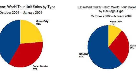 Przyzwyczailiśmy się już do narzekania na ceny zestawów instrumentów do gier muzycznych. Faktem jest, że potrafiły one być droższe, niż sama konsola. Dlatego informacje znalezione na stronach Gamasutry naprawdę mnie zdziwiły. Okazuje się bowiem, że amerykańscy gracze najchętniej kupowali właśnie pełny zestaw Guitar Hero: World Tour ze wszystkimi instrumentami. Najrzadziej natomiast sięgali po samą grę. Ilustruje to powyższy wykres. Po prawej stronie widzimy natomiast jak wygląda procentowy udział poszczególnych wydań w ogólnym przychodzie z gry. Tu, co oczywiste, przewaga pełnego zestawu jest jeszcze bardziej widoczna.Zaskoczeni? Ja owszem. Co więcej, nie znajduję jakiegoś łatwego wytłumaczenia tej sytuacji. Macie jakieś pomysły?