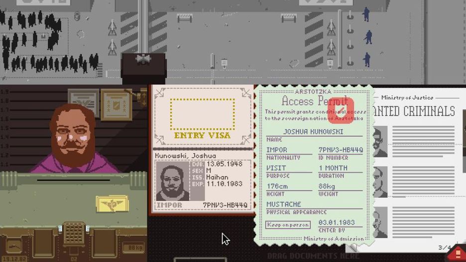 Wydawałoby się, że to gra, która odstręcza swoją rozgrywką. Bohater tkwi w małej budce, przez 8 godzin sprawdza dokumenty ludzi, którzy chcą wjechać do totalitarnego państewka. Porównuje stemple, sprawdza zgodność danych, przesuwając papieru po biureczku, na którym wiecznie brakuje miejsca. A wszystko po to, by odebrać zawsze za małą dniówkę i zastanawiać się, czy tym razem trzeba zrezygnować z jedzenia, ogrzewania czy może leków dla rodziny.