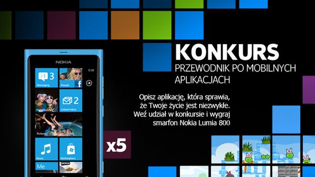 Chcemy dowiedzieć się od Was, z jakich aplikacji korzystacie i dlaczego inni powinni z nich korzystać. W konkursie zapytamy Was o programy z pięciu wymyślonych przez nas kategorii, które potem zamieścimy w zbiorczym poradniku. Autor, który w najciekawszy sposób przedstawi swoją ulubioną aplikację zostanie nagrodzony jednym z pięciu telefonów Nokia Lumia 800.