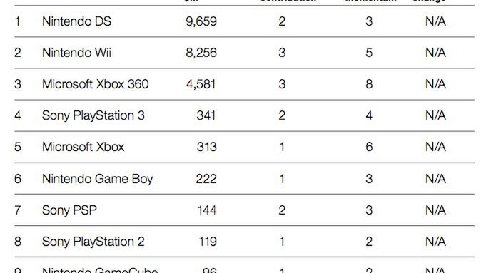 W corocznym raporcie Millwarda Browna dotyczącym wartości światowych marek znalazła się sekcja poświęcona grom. Jak więc prezentuje się nasz branżowy ranking? Na pierwszym miejscu platformy Nintendo, dopiero potem Xbox 360. Zwróćcie uwagę, jak mamy dużą różnicę (rząd wielkości) pomiędzy 3 i 4 miejscem, na którym wylądowało PS3.