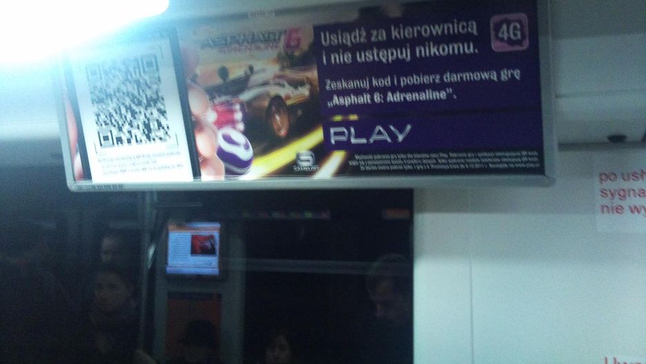 Sieć Play umieściła w wagonach warszawskiego metra ciekawą promocję. Wystarczy zeskanować kod z obrazka, by pobrać - zupełnie za darmo - grę Asphalt 6: Adrenaline.