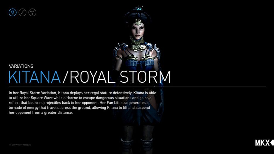 Royal Storm to styl oparty na walce dystansowej - najbardziej defensywny z wszystkich trzech. Assassin stawia na agresywną ofensywę, w której choćby kultowe wachlarze zadają większe obrażenia. Mournful wprowadza natomiast chyba najciekawsze zmiany - Kitana w tym wariancie wyposażona jest w kij i bumerang swojej przyjaciółki Jade, co wprowadza sporo nowych zagrań do - paradoksalnie - wachlarza jej ruchów.