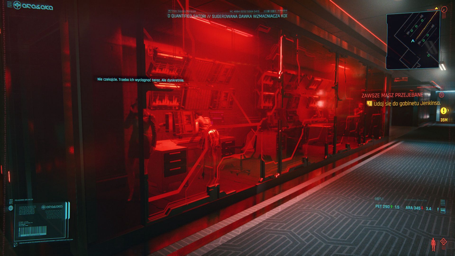 Ok, wybieram ścieżkę korporacji i zaczynam... w kiblu. Rzygając z nerwów do zlewu. Do słuchawki ktoś mi nawija o spotkaniu, a na ekranie widzę pasek z informacjami o stanie moich wewnętrznych enzymów, które wyrównuje mi specjalna aparatura - bajer, na jaki nie pozwoli sobie śmiertelnik z ulicy. Ale korposzczur z Arasaki już tak.
