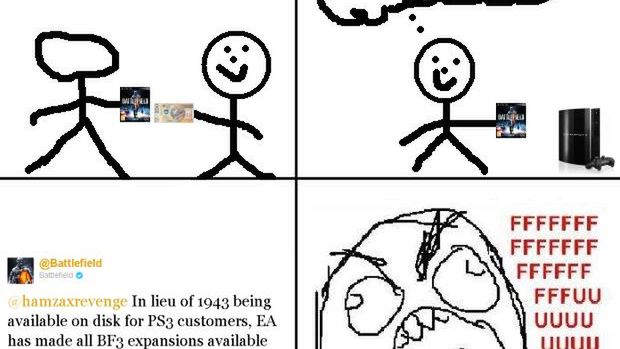 Jakiś czas temu Electronic Arts ogłosiło, że wszyscy, którzy kupią Battlefield 3 na PS3, znajdą na płytce także darmową kopię Battlefield 1943. Ot tak, w prezencie. Tymczasem gra już w sklepach jest, ludzie ją kupują, a żadnej innej produkcji oprócz BF3 tam nie ma...