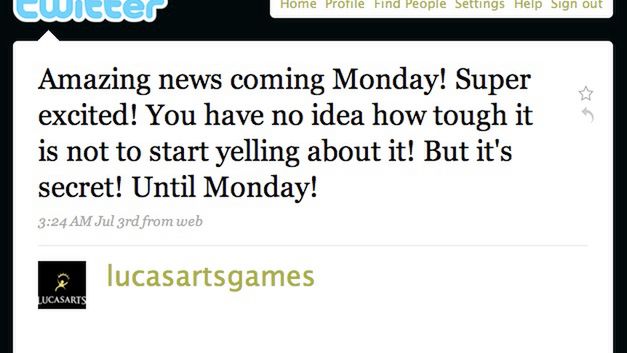 Ech, ogłoszenia ogłoszeń chyba stały się już standardem. No, przynajmniej na Twitterze. Tym razem drażni się z nami LucasArts, które opublikowało powyższą wiadomość (w tłumaczeniu: Mamy dla Was niesamowitą wiadomość, którą ogłosimy w poniedziałek. Jesteśmy nią bardzo podekscytowani. Nie macie pojęcia, jak jest nam ciężko nie rozgłaszać tego. No ale do poniedziałku to tajemnica.)