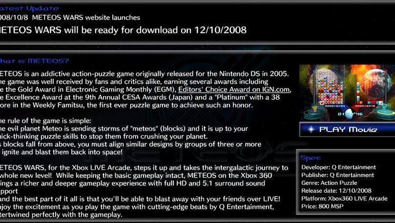 Jak informuje oficjalna strona gry Meteos Wars trafi na Xbox Live Arcade jeszcze w tę środę. Standardowa cena 800 MS punktów za kolejną dobrą grę Q Entertainemnt wydawałaby się jak najbardziej w porządku, choć martwi mnie troszkę kiepska grafika tytułu, która była chyba największą wadą wersji na DSa. Mimo wszystko jeśli ktoś lubi takie gry pokroju Lumines, to nie ma co się zastanawiać, szczególnie, że na horyzoncie nie majaczą jakieś nowe produkcje tego pokroju, a i gra online przeciw znajomym na pewno przyniesie sporo radości. Beniamin Durski