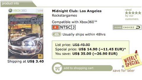 Trzeba przyznać, że Play-asia ma swoje cotygodniowe promocje coraz bardziej atrakcyjne i ostatnio oferuje już nie tylko gry sprzed 15 lat, albo dziwaczne, japońskie importy przeznaczone dla zupełnie nikogo. Od dziś można zakupić tam za niecałe 15$ japońską wersję Midnight Club: Los Angeles na 360, która jednak działa bezproblemowo na PALowych konsolach posiadając również pełną gamę języków. Recenzje nie są złe, a nawet w natłoku zimowych hitów powinno dać się wysupłać kilka dyszek na grę Rockstar. Nie nastawiajcie się tylko na allegrowych "byznesmenów" - limit wynosi jedna sztuka na osobę, więc jeśli ktoś chce, to musi postarać się sam i to w miarę szybko - promocja potrwa tydzień lub do wyczerpania zapasów.