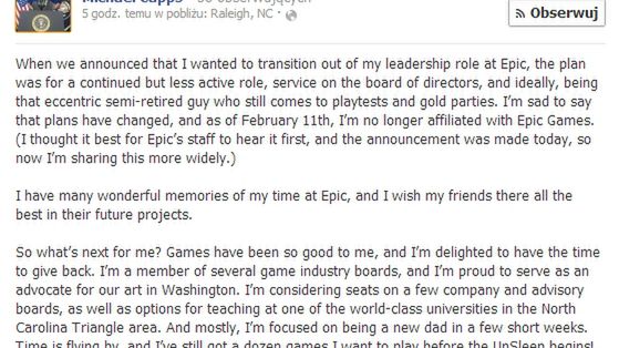 Dzisiejsza wiadomość, to właściwie dopełnienie tamtej - Capps na swoim profilu Facebookowym ogłosił, że plany się zmieniły i od 11 lutego nie jest już w ogóle związany z Epic Games.