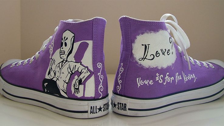 Nie ma to jak zacząc poranek od obejrzenia pięknego obuwia. Kolor fioletowy ostatnio coraz bardziej mnie do siebie przekonuje, a jeśli na trampkach Converse'a dodatkowo spoczywa Manny Calavera spokojnie oddający się przyjemności palenia to nie mogłem zostac obojętny. Przepiękny egzemplarz, którego autor większą ilością zdjęc chwali się tutaj. Przypominam jednocześnie, że wciąż czekam na pierwszą parę polskich butów growych. W skrócie, PPPBG.