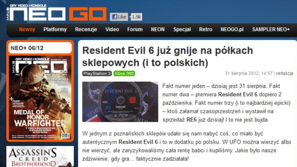 31 sierpnia w jednym ze sklepów w Poznaniu na półkach pojawiło się kilka pudełek z Resident Evil 6 w wersji na PlayStation 3. Do kupienia, jak najbardziej legalnie. Żadne piraty, oryginalne kopie. Wszystko byłoby w porządku, gdyby nie fakt, że premiera gry w Europie zaplanowana jest dopiero na... 2 października. Nic dziwnego, że w sieci zawrzało. O wydarzeniu tym napisały praktycznie wszystkie najważniejsze serwisy dotyczące elektronicznej rozrywki na świecie. To, co dla jednych było jednak tylko ciekawostką, dla pewnego polskiego magazynu stało się ciężkim orzechem do zgryzienia...