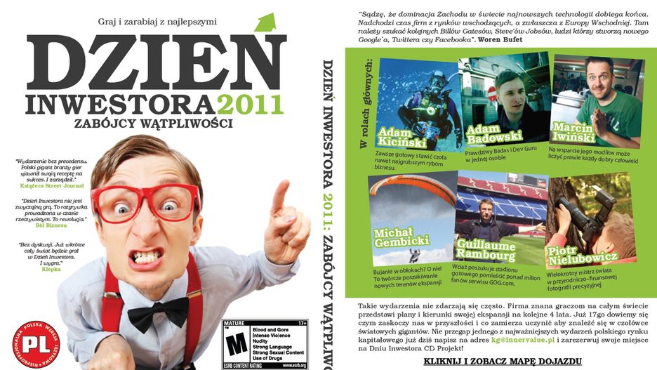 CD Projekt już raz prezentował swoje ogłoszenia za pomocą okładek, czy też zwiastunów nieistniejących gier. Wcześniej mogliśmy obejrzeć Marketng Director 2: Rise of Sales, który był po prostu ogłoszeniem o pracę. Teraz zaproszenie na listopadową konferencję firmy przedstawiono jako okładkę gry Dzień Inwestora 2011: Zabójców Wątpliwości (poniżej w pełnej rozdzielczości).