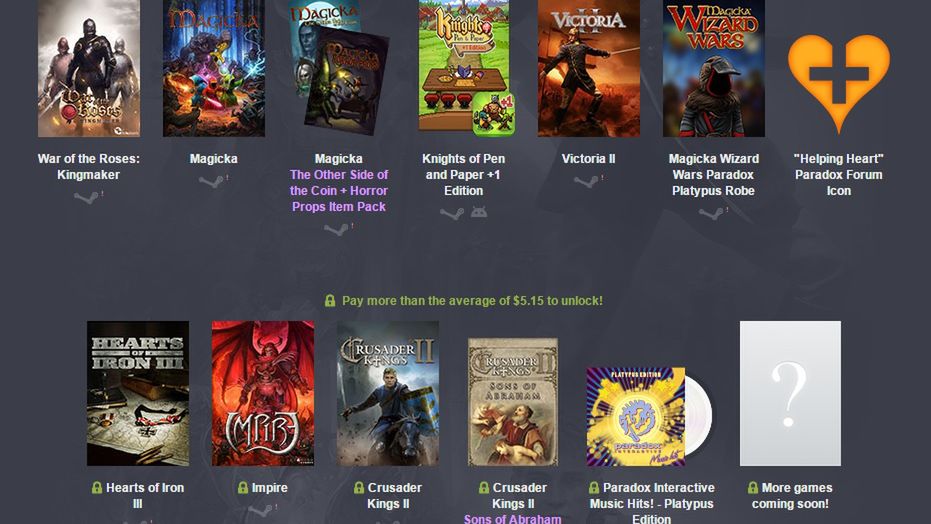 Jeżeli zapłacimy powyżej średniej (aktualnie 5,15$), zagramy jeszcze w Hearts of Iron 3, Impire i Crusader Kings 2 wraz z dodatkiem oraz otrzymamy składankę utworów z gier Paradox Interactive. Czas jeszcze pokaże, co ponadto znajdziemy w tym pułapie.