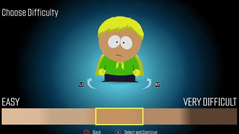 To z kolei komentarz Cartmana w trakcie wyboru. Autorzy gry doprecyzowali Eurogamerowi, że poziom trudności będzie wiązał się z ilością zarabianych pieniędzy oraz... tym jak ludzie w grze będą odnosić się do naszej postaci. Biada rasistom i ksenofobom. Będą musieli przekonać się co jest mocniejsze - ich uprzedzenia czy chęć wbicia calaka/platyny.