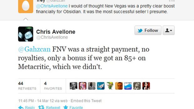 Chris Avellone, projektant gier, został zapytany przez fana na Twitterze, czy studio zarobiło na Fallout: New Vegas. Okazuje się, że zapłata od wydawcy ograniczyła się do pensji, bez zysków ze sprzedaży. Przewidziano specjalną premię, ale tylko wtedy, gdy średnia ocen gry na Metacritic przekroczy 85 punktów. No i...