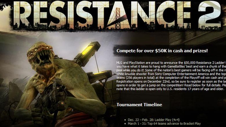Major League oraz PlayStation zorganizują razem turniej Resistance 2, w którym pula nagród osiągnie 50 tysięcy dolarów. Pojedynki będą rozgrywane w drużynach 4 osobowych, a zwycięska ekipa zdobędzie nagrodę główną wynoszącą 9 tysięcy dolarów. Jeśli zatem macie silną ekip i mieszkacie w Stanachto zdecydowanie warto spróbować. Szczegóły znajdziecie tutaj.