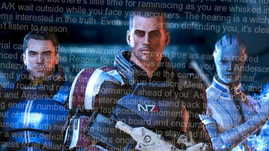 Oskarżony Shepard W roboczej wersji scenariusza (RWS), gra zaczyna się od wojskowego procesu Sheparda, który zostaje szczęśliwy przerwany przez inwazję obcych. W finalnej wersji gry (FWG) jest już dawno po procesie, kiedy komandor przekonuje dowództwo, że Żniwiarze są zagrożeniem, a ci akuratnie pojawiają się za oknami, aby potwierdzić jego racje.