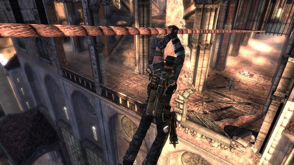 Sam bohater, Hamilton, rusza się troszkę jakby z tyłu biegł mały gnom, trzymający długi patyk wetknięty w Hamiltona. A gracz zamiast sterować bohaterem, steruje gnomem. Celowanie jest gorsze niż w Killzone 2 (a to dużo powiedziane), chodzenie jest niedokładne (to przez gnoma), a skakanie, które powinno być przecież clou programu, zawodzi na całej linii. Trik jest tylko jeden - można wskoczyć na ścianę, a z niej wybić się wyżej, łapiąc się krawędzi po drugiej stronie. Ale zwykle można to zrobić tylko w miejscach przewidzianych przez autorów. Do tego sam skok jest wyjątkowo upierdliwy, często trzeba go powtarzać kilka razy i wykonuje się go tylko dokładnie w przeciwną stronę do ściany. Żadnego kombinowania ze skakaniem po skosie. A kiedy już się zaczyna udawać, okazuje się, że płynność ruchu i tak co chwilę łamie animacja bohatera - powolne podciąganie się, powolne obroty, powolne skoki. W grze która stawia na wspinaczkę, spodziewałem się przemyślanego super systemu skakania, a tymczasem Rourke nie potrafi nawet doskoczyć do daszku znajdującego się niecały metr nad jego głową. I choć poziomy zaprojektowano tak, że rzeczywiście zachęcają do pokonywania ich zarówno w pionie jak w poziomie, to sterowanie robi wszystko, by gracz wybił sobie to z głowy.