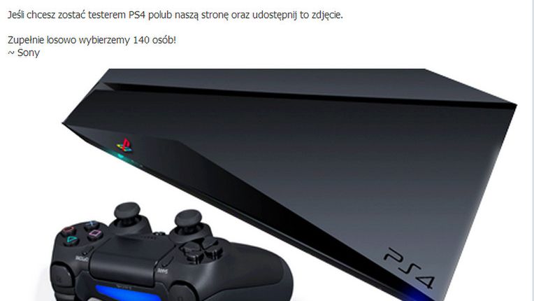 Wystarczy nazwać swój facebookowy fanpage "Playstation 4" i napisać, że szuka się testerów konsoli - by zgłosić akces, wystarczy polubić stronę i udostępnić zdjęcie. "Zupełnie losowo wybierzemy 140 osób!" - brzmi kłamstewko. Oczywiście po testach konsola zostanie u testera. Haha.