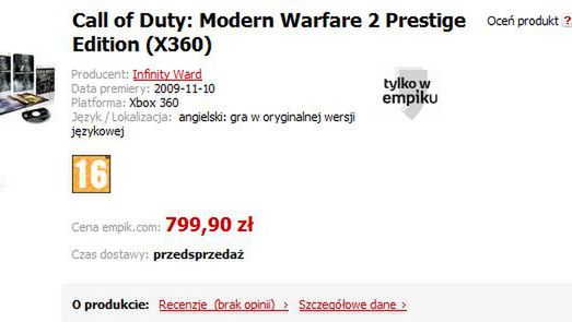 Gdy Maciu pisał o cenie 149 dolarów dla wydania Call of Duty: Modern Warfare 2 w Stanach Zjednoczonych to po szybkich przeliczeniach w głowie strzelałem, że u nas gra z noktowizorem (tzw. prestiżowa edycja) będzie kosztowała raptem 700zł. Okazuje się, że wcale się tak bardzo nie pomyliłem...