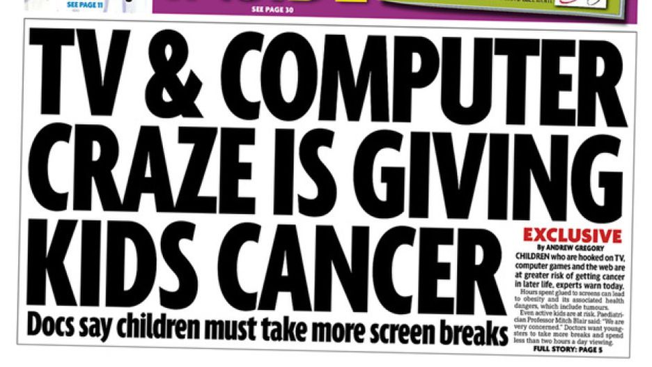 "Szał na telewizję i komputery powoduje raka u dzieci" - krzyczy pierwsza strona dziennika. "Lekarze mówią, że dzieciaki potrzebują więcej odpoczynku od ekranów" - dodaje podtytuł.