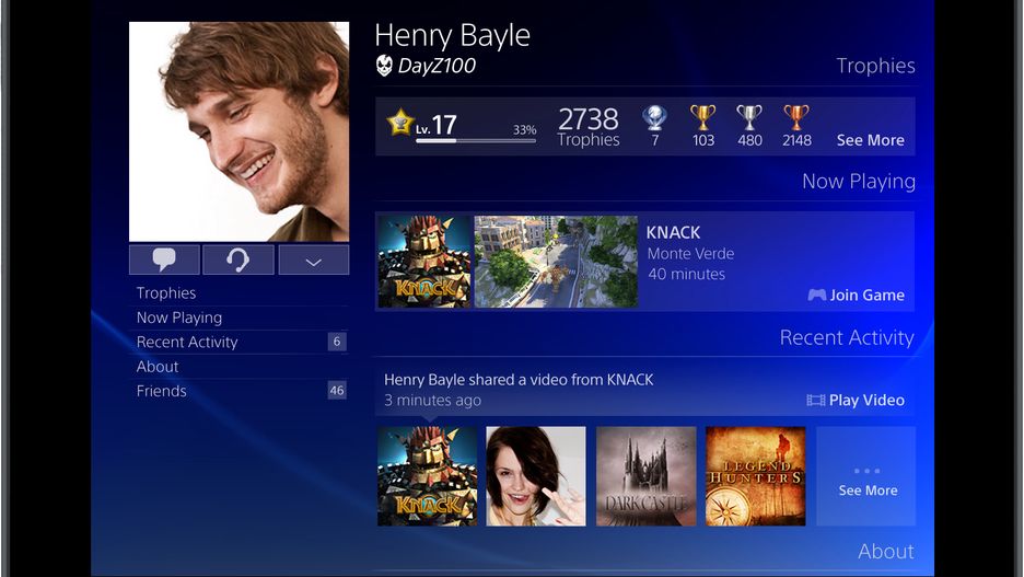 Główny ekran, z listą gier, w którą ostatnio graliśmy (albo mamy w ogóle?). W tym wypadku ostatni był Knack. Uwagę zwracają statystyki, a wśród nich "liczba przyjaciół, którzy mają grę" i "liczba udostępnionych multimediów związanych z grą", zaś najczęściej oglądane wideo wystawione na główną. Da się też zauważyć, że zaproszenie do gry ma formę zwykłego tekstu na ekranie, a nie okienka popup w rogu.