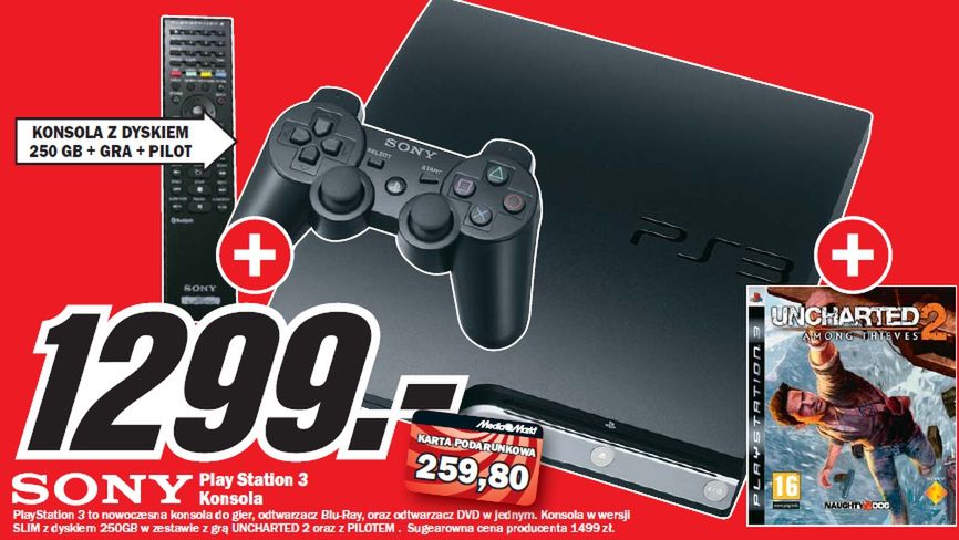 W najnowszej ulotce promocyjnej sieć Saturn mocno promuje konsolę PS3 Slim z dyskiem 250GB umieszczając ją w tyskiej edycji gazetki na pierwszej stronie. W zestawie łącznie z grą Uncharted 2: Among Thieves (nasza recenzja tutaj) konsola kosztuje 1390 zł w 20 ratach po 69,50 zł