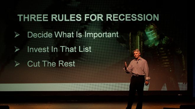Naprawdę myślę, że kryzys ekonomiczny to błogosławieństwo dla całej branży. Mnóstwo hołoty zbankrutuje. Nie będziemy musieli konkurować z badziewiem. Staliśmy się za duzi w wielu dziedzinach i za bardzo polegaliśmy na dawnym stanie rzeczy Oczywiście cięcia nie ominęły też Electronic Arts, ale jak dowiedzieliśmy się, były one potrzebne, bo firma zrobiła się "za gruba". Co więcej zwolnienia zaczęły się wśród kadry zarządzającej i poszły w dół, nie było to zaś typowe "odcięcie dołów organizacji". Dzięki temu firma stała się znowu szczupła i zwinna, będzie mogła lepiej adaptować się do sytuacji rynkowej.